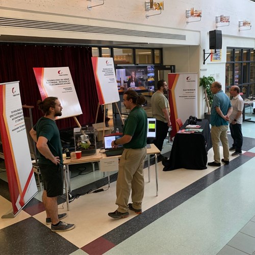 C’est dans une ambiance de fébrilité et de fierté que les quelque 30 finissants en Automatisation et contrôle, Électronique programmable et Réseaux et télécommunications (tous des programmes en Technologie du génie électrique), ont présenté leurs projets de fin d’études lors d’un salon ouvert à tous, le 5 juin dernier. Ils étaient accompagnés pour l’occasion de leurs collègues de Technologie de l’électronique : Audiovisuel, qui avaient préparé certains montages et plateaux propres à leur discipline.