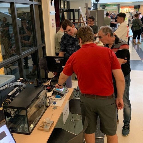 D’un aquarium à un fumoir automatisés, d’une serre contrôlée par cellulaire à un affichage intelligent à DEL en rotation en passant par un distributeur d’aliments pour chat, un lanceur de balle pour chien ou un panier de basketball intelligent, la grande variété ainsi que la qualité des projets en ont impressionné plus d’un! Parents, amis, représentants du marché du travail et grand public ont pu parcourir les différents kiosques afin de constater par eux-mêmes de la grande étendue des compétences de nos finissants.