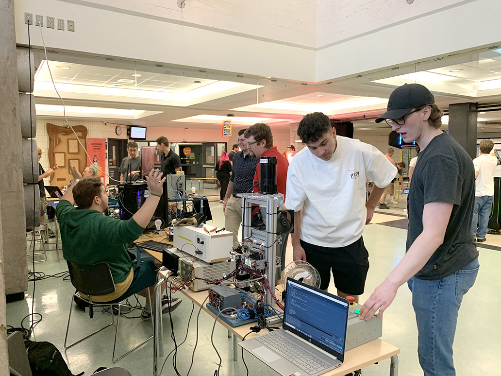 C’est dans une ambiance de fébrilité et de fierté que les quelque 30 finissants en Automatisation et contrôle, Électronique programmable et Réseaux et télécommunications (tous des programmes en Technologie du génie électrique), ont présenté leurs projets de fin d’études lors d’un salon ouvert à tous, le 5 juin dernier. Ils étaient accompagnés pour l’occasion de leurs collègues de Technologie de l’électronique : Audiovisuel, qui avaient préparé certains montages et plateaux propres à leur discipline.