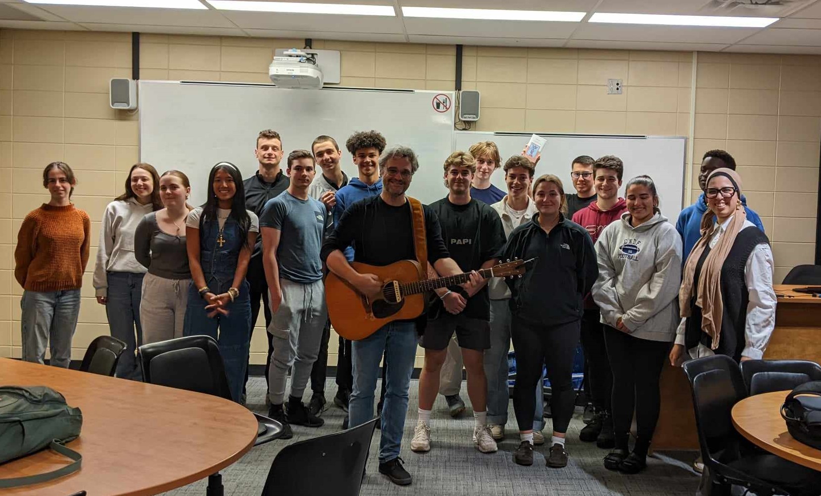 Les étudiants et étudiantes du cours Temps présent en Sciences humaines ont eu le plaisir de rencontrer l’auteur-compositeur-interprète Thomas Hellman qui est venu leur présenter la Conquête de l’Ouest et la Crise des années 1930 aux États-Unis, sujets de ses deux albums, Rêves américains. Les différentes pièces musicales mettent l’accent sur les impacts sociaux et économiques pour la population, une thématique qu’il a développée avec des exemples précis, tout en mettant en valeur des aspects moins connus de l’histoire américaine. Henry Ford, Winston Churchill, John Steinbeck, Joe McCarthy et Henry David Thoreau, les populations amérindiennes… et les bisons font notamment partie de ce décor historique.